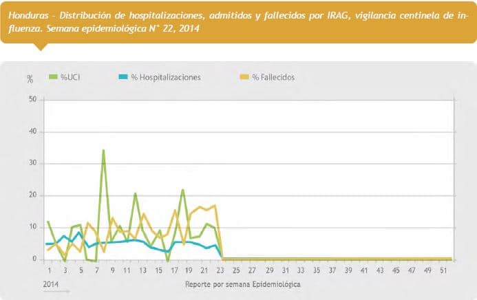En Honduras, durante SE 22, las proporciones de atenciones por ETI (5,7%), hospitalizaciones por IRAG (4,9%) y fallecidos por IRAG (16,9%) incrementaron comparadas a la semana previa. Durante la SE 22, se procesaron 34 muestras, de las cuales 9 (26,5%) fueron positivas a influenza B.