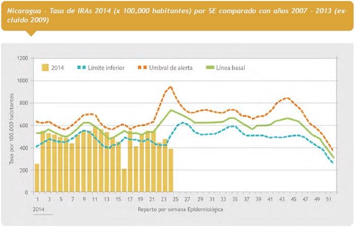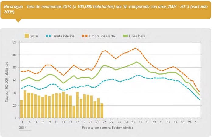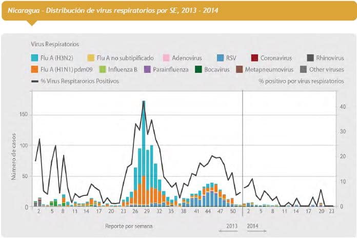 En Nicaragua, en la SE 24, las tasas nacionales de neumonías y de IRA disminuyeron comparado a la semana previa y estuvieron dentro de lo esperado por esta época del año. Según los datos del laboratorio entre las SE 20-23 se procesaron 232 muestras, de las cuales cinco (2,2%) fueron positivas para virus respiratorios (60% parainfluenza y 40% influenza A(H1N1)pdm09).