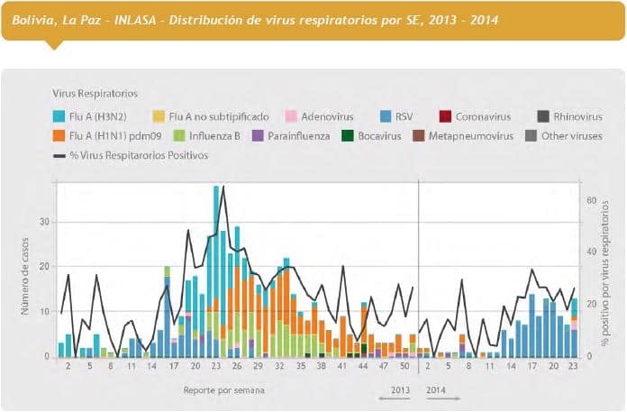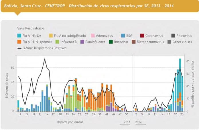 En Bolivia, se observó aumento de actividad de VSR y de influenza. De acuerdo a los datos del laboratorio de Santa Cruz (CENETROP) entre las SE 20-23, se analizaron 374 muestras, de las cuales el 61,0% fueron positivas a virus respiratorios y 50,3% fueron positivas a influenza. Entre las muestras positivas, predominó influenza A(H3N2) (68,0%) seguido por VSR (17,5%). De acuerdo al Laboratorio Nacional de la Paz (INLASA) entre las SE 20-23, se analizaron 181 muestras, de las cuales, el 22,7% fueron positivas a virus respiratorios y 3,3% a virus de influenza. Entre las muestras positivas, predominó VSR (80,5%), seguido por influenza A(H3N2) (12,2%).