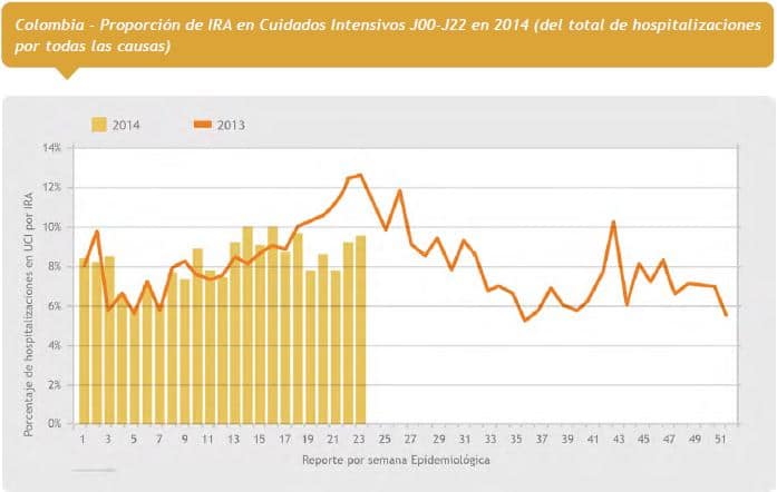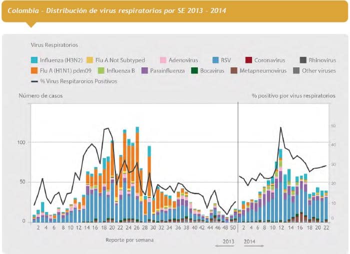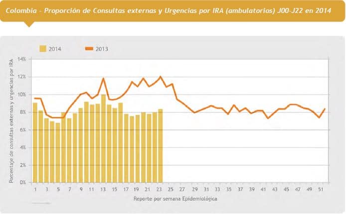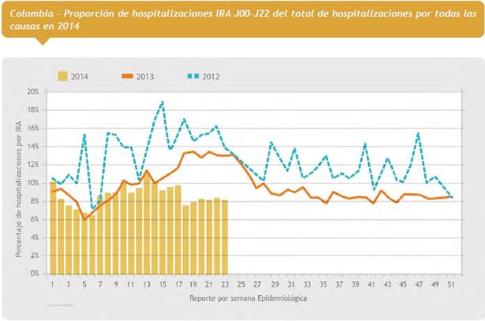 En Colombia, a nivel nacional durante la SE 23, las proporciones de las consultas externas y urgencias por IRA (8,3%), hospitalizaciones asociadas a IRAG (8,2%) e ingresos a UCI por IRAG (9,5%), según CIE-10 (códigos J00 a J22), estuvieron dentro de los niveles esperados por este época del año. Según los datos del laboratorio del INS, entre las SE 19-22 se analizaron 567 muestras, de las cuales el porcentaje de positivas a virus respiratorios fue 28,6% y a influenza fue 4,9%. Entre las muestras positivas, predominó VSR (59,9%) seguido por influenza A(H3N2) (12,3%).