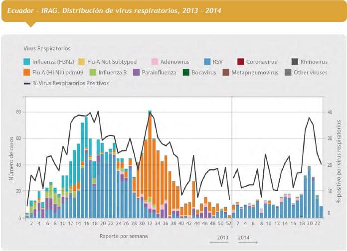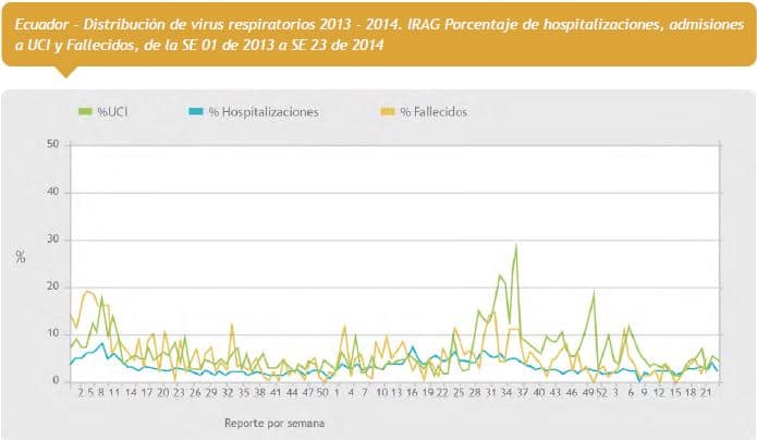 En Ecuador, durante la SE 23, las proporciones hospitalizaciones por IRAG (2,5%) e ingresos a UCI por IRAG (4,9%) disminuyeron comparadas a la semana previa, mientras la proporción de fallecidos asociados IRAG (4,8%) incrementó. Según los datos del laboratorio, entre las SE 20-23 e procesaron 305 muestras de IRAG, con un porcentaje de positividad para virus respiratorios de 31,5% y 1,0% para virus influenza. Entre las muestras positivas, predominó VSR (93,8% de las positivas).