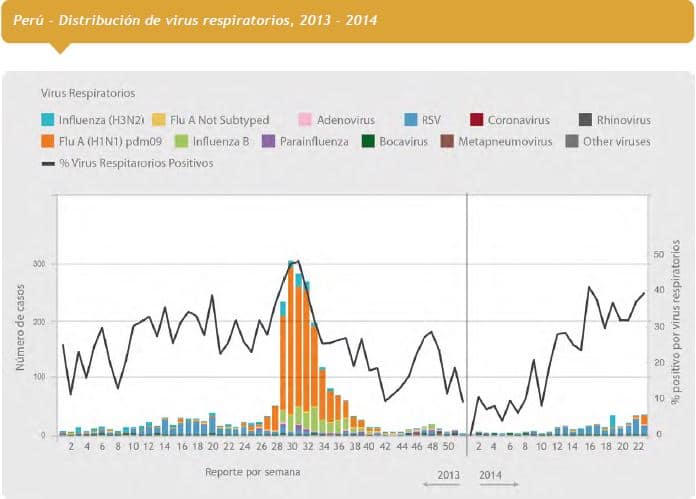 En Perú, según datos del laboratorio nacional, entre las SE 20-23 se procesaron 288 muestras, de las cuales el porcentaje de positivad a virus respiratorios fue de 35,8% y a influenza fue de 9,0%. Entre las muestras positivas, predominó VSR (67,0%) seguido por influenza A(H1N1)pdm09 (17,5%).