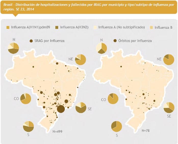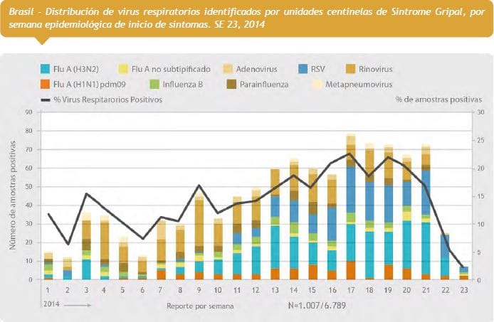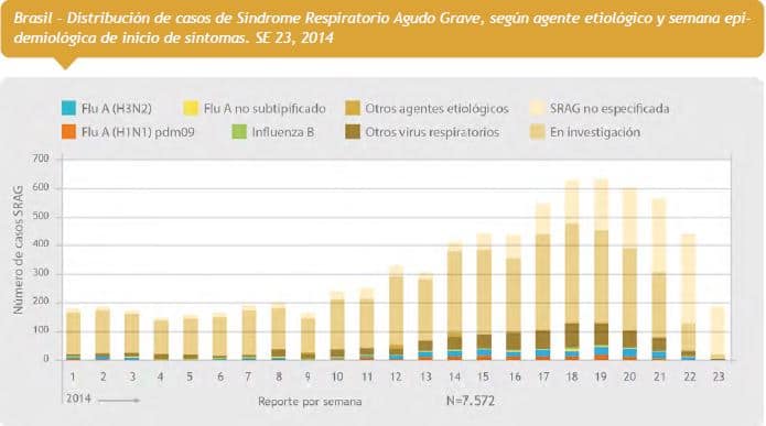 En Brasil7, según la vigilancia centinela de ETI hasta la SE 23, se han procesado 6.789 muestras de las cuales el 14,8% resultaron positivas para virus influenza y otros respiratorios. Entre las muestras positivas a influenza, predominó influenza A(H3N2) (25,2% de las muestras positivas). La mayor proporción de las muestras positivas procedían de las regiones en el sur y sureste del país. En la vigilancia universal de IRAG y para el mismo periodo, se notificaron 7.575 casos de IRAG con 6,6% identificados como positivos para el virus influenza. Entre las muestras positivas, predominó A(H3N2) (51,5%) seguido por A(H1N1)pdm09 (32,9%). El mayor número de los casos de IRAG se reportaron en la región sureste, principalmente Sao Paulo. Hasta la SE 23, se han notificado 728 casos letales asociados a IRAG, de los cuales se ha confirmando influenza en el 10,7% (57,5% influenza A(H1N1)pdm09 y 26,9% A(H3N2)).