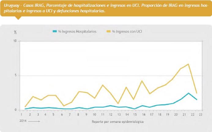 En Uruguay10, durante la SE 23 las proporciones de hospitalizaciones, ingresos a UCI y defunciones por IRAG disminuyeron en comparación con la semana previa y estuvieron dentro de los niveles esperados por esta época del año. Según los datos del laboratorio, entre las SE 20-23 se procesaron 63 muestras, de las cuales 30,2% fue positivas para virus respiratorios y 1,6% para virus de influenza. Entre las muestras positivas, predominó VSR (78,9%).