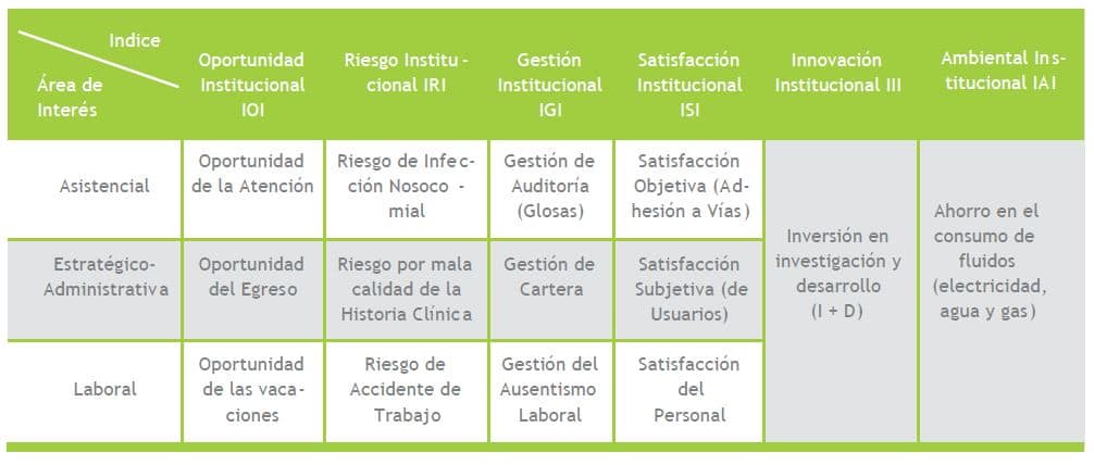 2. Diseño y presentación de la matriz con los seis (6) índices seleccionados: Oportunidad, Riesgo, Gestión, Satisfacción, Innovación y Ambiental, para un total de 14 indicadores, relativos a estructura, procesos y resultados dentro de las tres áreas clave de una organización de salud tipo: Asistencial, Estratégico/Administrativa y Laboral.