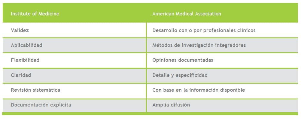 Tabla 2. Atributos que deben cumplir las guías de práctica clínica y los protocolos según el Instituto de Medicina y la Asociación Médica Americana (69)
