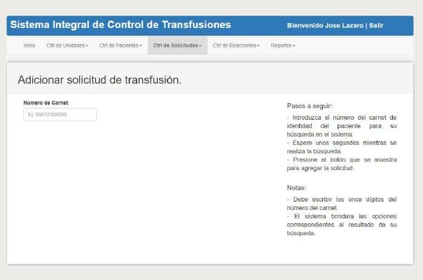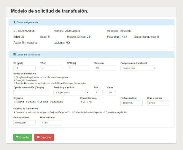 El servicio de transfusiones forma parte indispensable para el funcionamiento de cualquier sistema de salud. En este servicio se generan considerables volúmenes de datos, además de basar su efectividad en el control y aprovechamiento óptimo de sus recursos. Mantener la información de este servicio correctamente actualizada en tiempo real es vital, debido a que la sangre es un elemento que no se puede producir artificialmente y por tanto ha de ser utilizado de la manera más eficiente posible. Sin embargo, actualmente no cuenta, a nivel nacional, con una solución informática capaz de realizar esta tarea de manera eficiente(10).