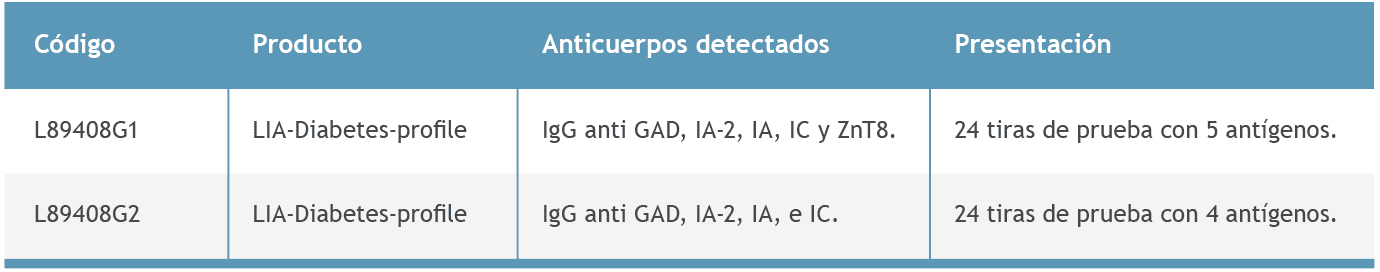 LIA-Diabetes-Profile posee dos versiones, la primera permitiendo la detección y diferenciación de anticuerpos IgG anti IAA, GADA, IA-2A e ICA; y la segunda que, además de los mencionados, también detecta ZnT8.