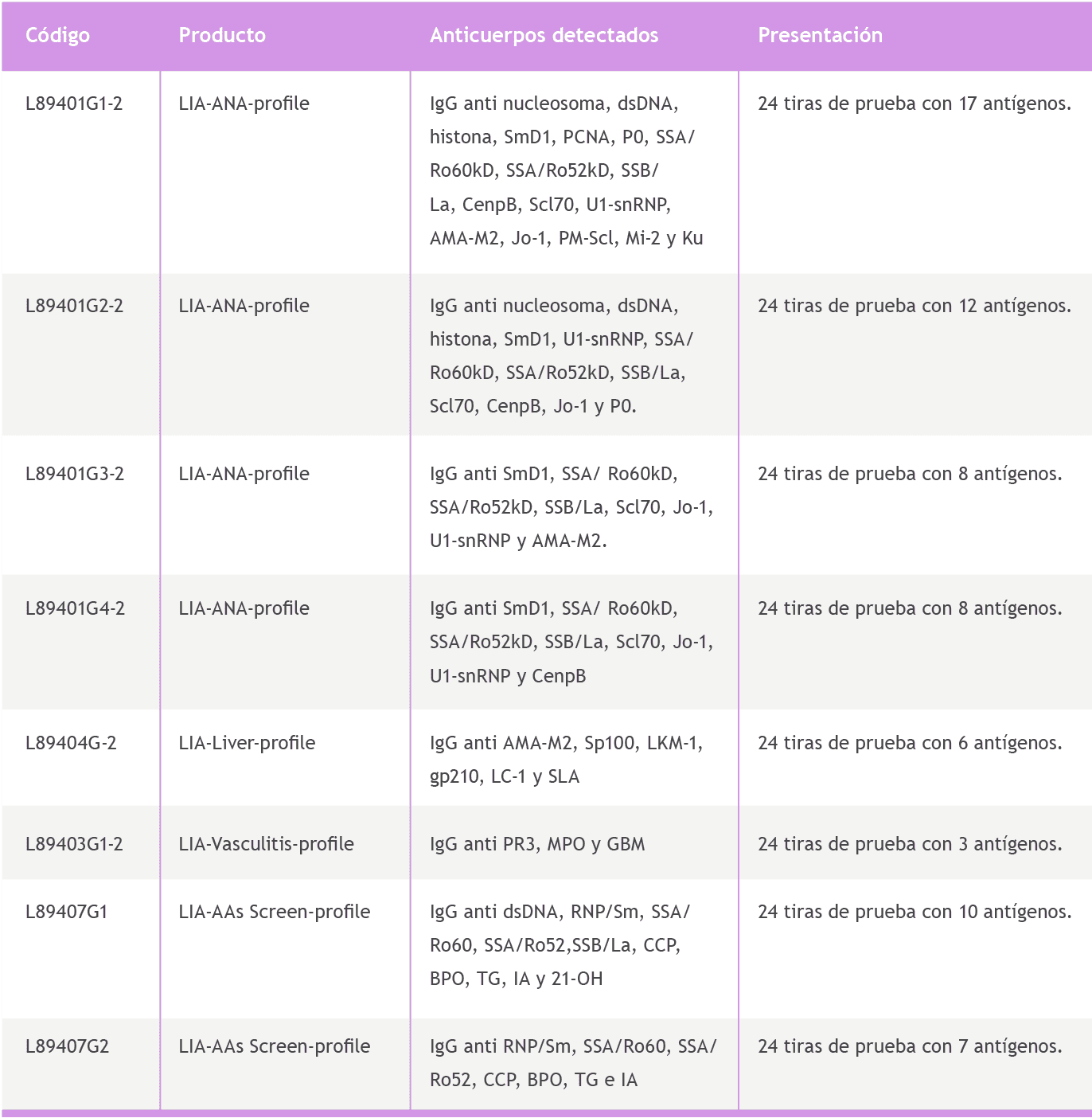 Además de estos dos ensayos, también se encuentran disponibles los siguientes LIA para el diagnóstico y clasificación de múltiples enfermedades autoinmunes:
