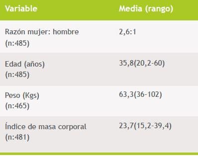 El análisis multivariado considerando los tres grupos de respuesta, mostró sin embargo, asociación significativa sólo con la edad (p = 0,01). La asociación con el sexo no fue significativa (p = 0,09). Tampoco se demostró asociación con IMC (p = 0,57) ni con el peso corporal (p = 0,26).