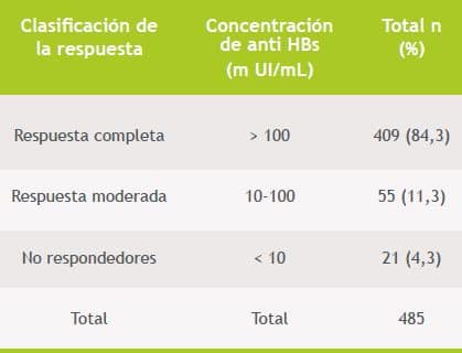 Los resultados de los títulos de anti HBs de los 485 funcionarios, obtenidos hasta los 6 meses post-vacunación se observan en la Tabla 2: 409 (84,3%) presentaron respuesta completa, 55 (11,3%) fueron respondedores moderados y 21 sujetos (4,3%) fueron no respondedores.