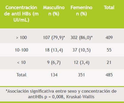Tabla 3. Respuesta inmunológica a la vacuna anti hepatitis B según el sexo (n: 485)