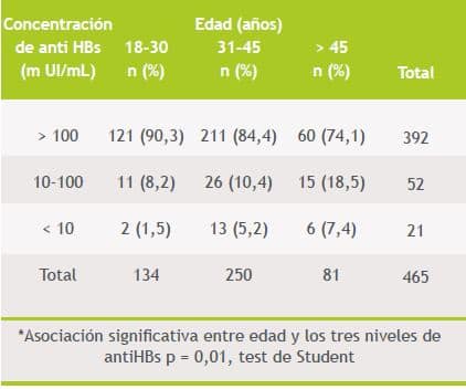 Tabla 4. Respuesta inmunológica a la vacuna anti hepatitis B según grupo de edad (n: 465)