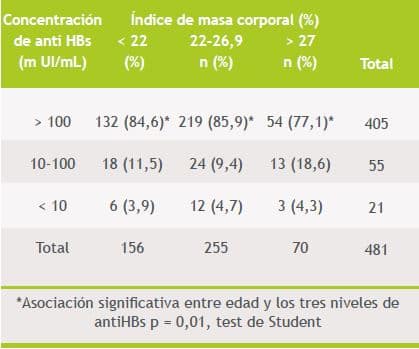 Tabla 5. Respuesta inmunológica a la vacuna anti hepatitis B según el índice de masa corporal (n: 481)