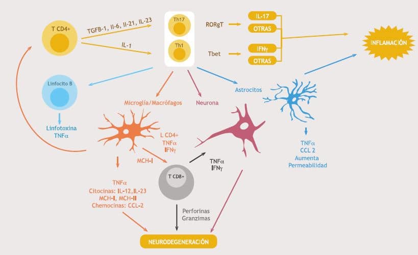 Cabe destacar que las células Th1 y Th17 también promueven la activación de microglia, macrófagos, astrocitos y linfocitos B a través de la producción de citoquinas y factores de crecimiento, activando consecuentemente mecanismos adicionales neurodegenerativos. Por ejemplo, las células Th1 y Th17 producen GM-CSF, el cual activa funciones neurodegenerativas en microglia21-23. Finalmente la proteína podoplanina, producida por las células Th17, promueve la formación de nódulos linfáticos terciarios en el SNC en los cuales se establecen y diferencian células productoras de anticuerpos24, 25.