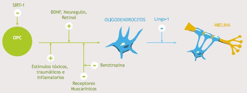 Entre las vías activadoras naturales de la remielinización se encuentran el retinol y su receptores gamma72. Factores de crecimiento como la neuregulin o BDNF también pueden promover la mielinización73. El conocimiento de todas las vías y moléculas implicadas en el complejo proceso de remielinización son esenciales para desarrollar dianas terapéuticas y restablecer la funcionalidad de las lesiones desmielinizadas.