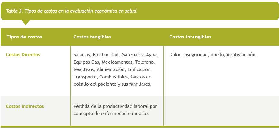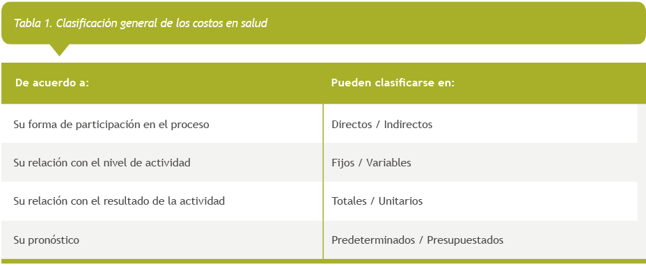 El costo en salud se refiere al valor de los recursos utilizados durante la provisión de cuidados de salud. Por valor se entiende su expresión en términos monetarios. Entre las clasificaciones de costos más empleadas en la economía de la salud se encuentran: tangibles e intangibles, directos e indirectos, sanitarios y no sanitarios, fijos y variables y totales y unitarios (28-33).