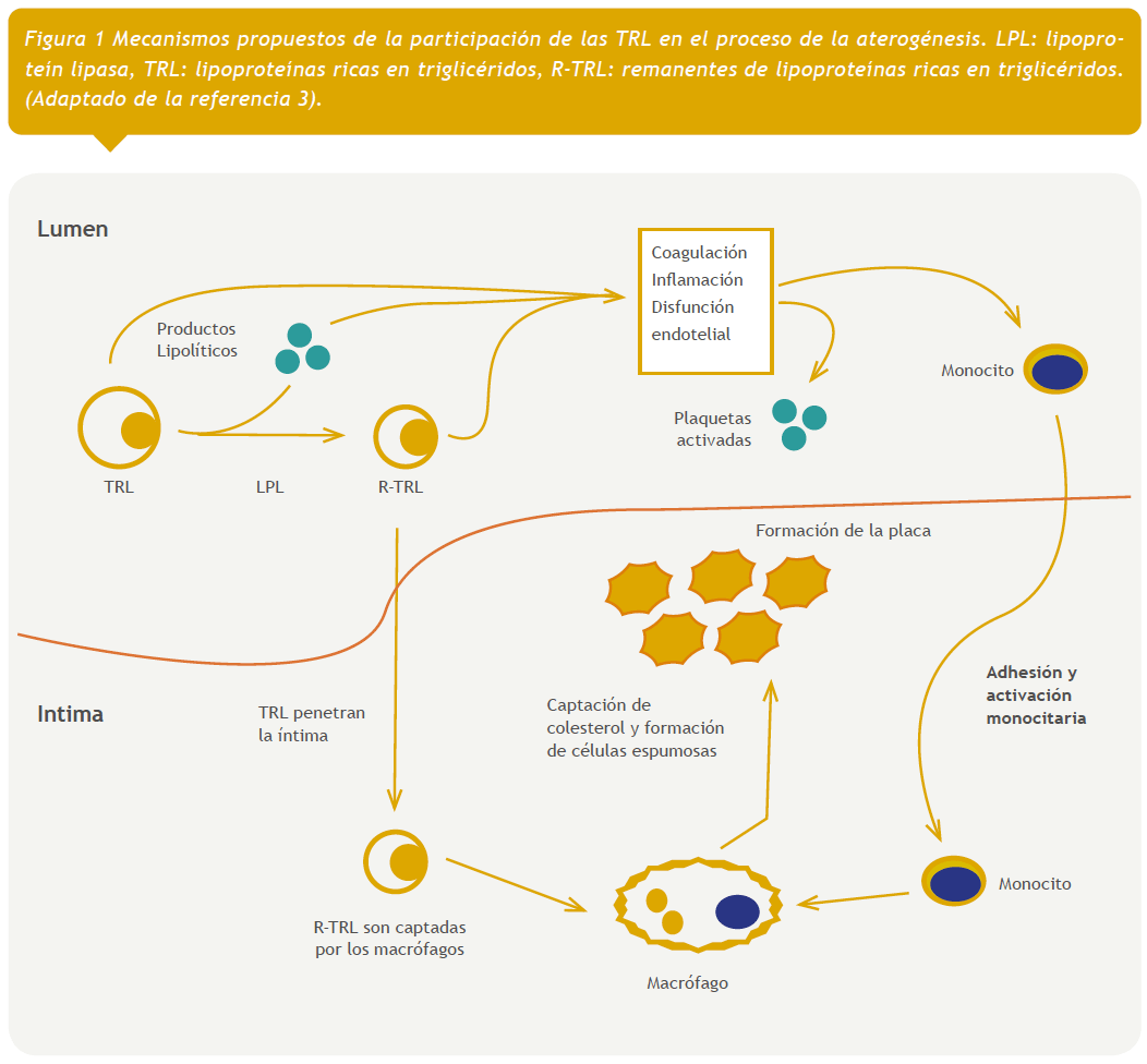 Se han propuesto dos mecanismos generales de aterogenicidad de las TRL: uno directo, penetración de la pared arterial y captación por los macrófagos; y otro indirecto, generación de productos lipolíticos, a partir de los QM y de las VLDL y por medio de la LPL, que causan disfunción endotelial.
