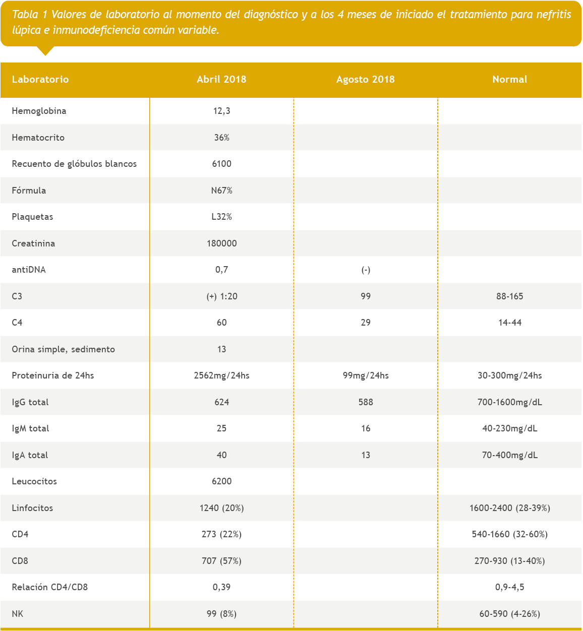 En abril del 2018, la paciente retornó con sus resultados y se realizó el diagnostico de inmunodeficiencia común variable y nefritis lúpica probable. No fue posible realizar una biopsia renal por motivos económicos. Se inició tratamiento para ambas patologías en forma concomitante. La paciente recibió 3 bolos de 500mg de metilprednisolona y quedó luego con prednisona 60mg/día con descenso gradual. Como fármaco de inducción, recibió 1g de ciclofosfamida en forma mensual durante 6 meses. Al mismo tiempo, recibió 2g/kp de inmunoglobulina humana endovenosa que fue pauta- do cada mes y profilaxis contra P. jirovecii. Durante el tratamiento de inducción, presentó una infección de vías aéreas superiores y una infección urinaria, que no revistieron gravedad.