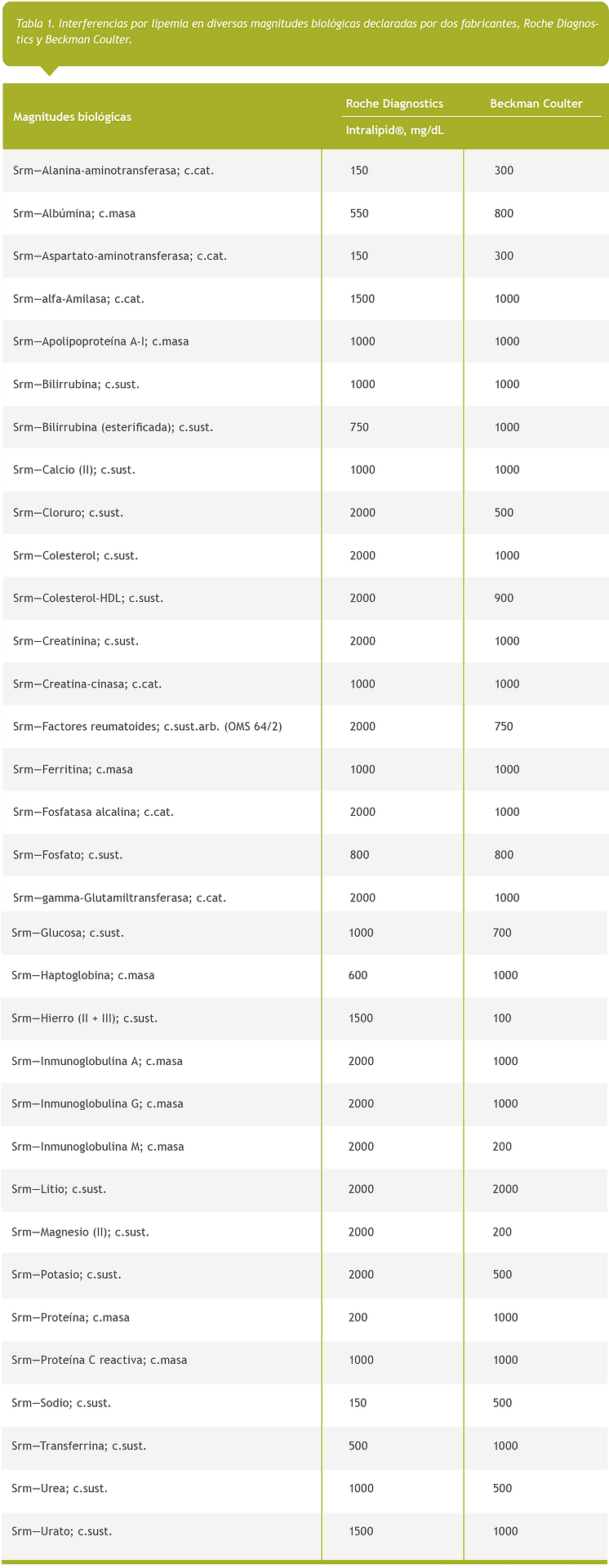 Además, el límite de error máximo admisible reportado por los fabricantes varía en función del instrumento, método analítico y criterio del fabricante, Roche Diagnostics y Beckman Coulter, ambos estudian la interferencia por lipemia a través de la adición de Intralipid® a muestras de suero pero existen diferencias a la hora de informarlo (Tabla 1).