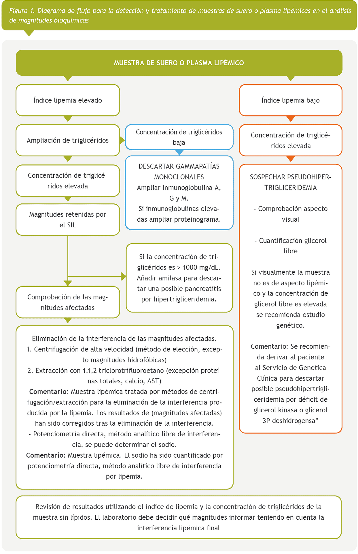 Es importante realizar algún método semicuantitativo para la medición del índice de lipemia en las muestras de suero/plasma y la cuantificación de triglicéridos y tener presente las posibles interferencias en el método analítico utilizado para la medición de triglicéridos. En caso de concentración elevada de triglicéridos e índices de lipemia bajos, sospechar de pseudohipertrigliceridemia por aumento de glicerol basal.