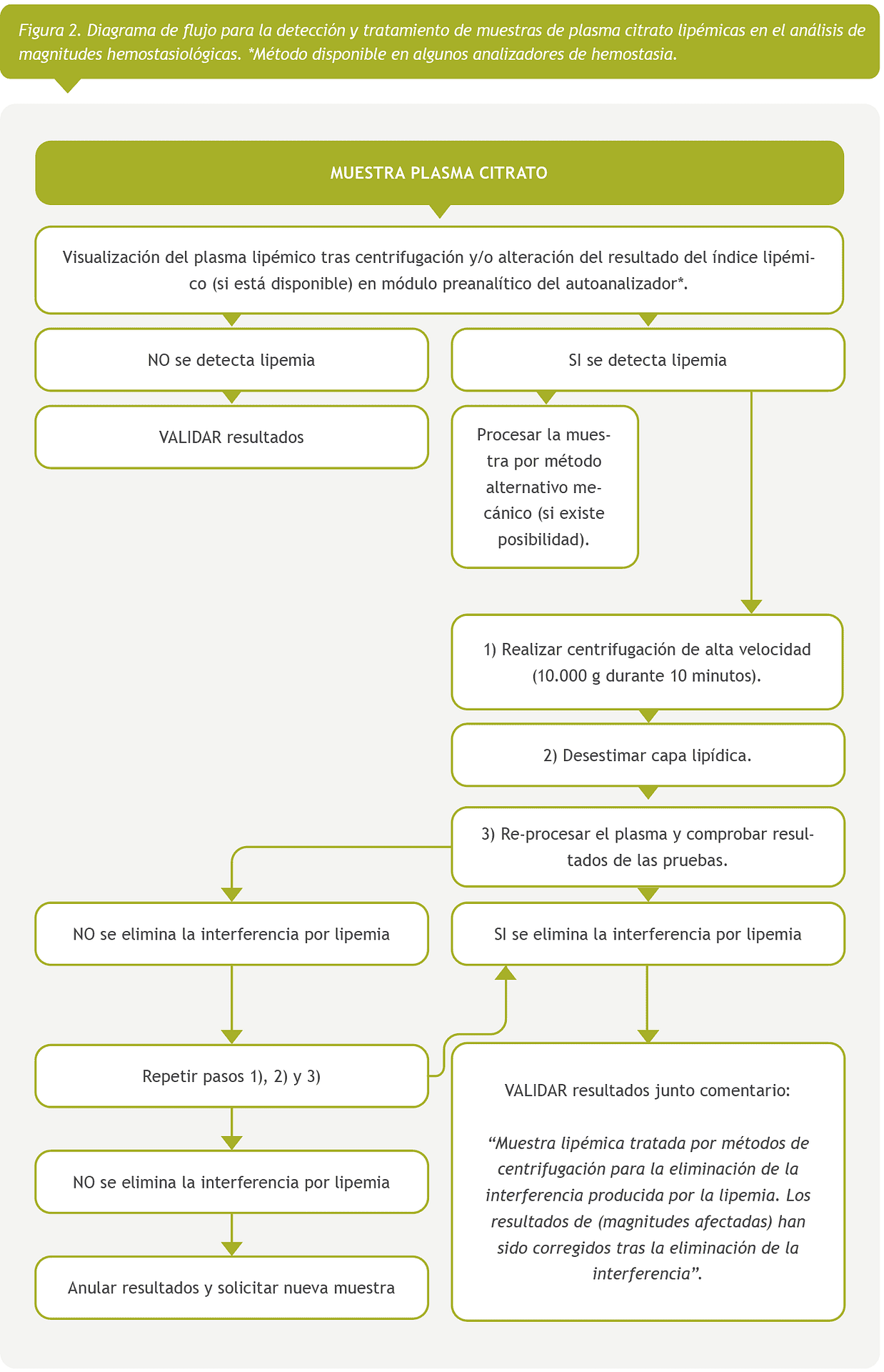 En la determinación de magnitudes hemostasiológicas existen analizadores que disponen de un modúlo preanalítico que nos informa sobre la presencia de lipemia. Los intervalos a partir de los cuales las magnitudes se ven interferidas por lipemia están definidos por los propios fabricantes sin margen de modificación. Los analizadores emitirán una alarma cuando el índice de lipemia supere el umbral definido en cada magnitud. Algunos analizadores que no disponen del módulo preanalítico emiten una alarma de sospecha por lipemia, en estos casos se debe comprobar visualmente.