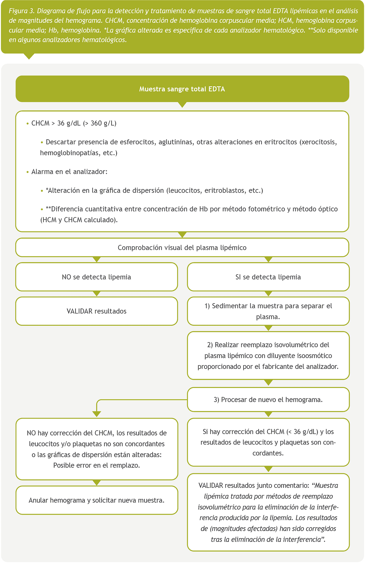 En sangre total no existen unos índices que nos informen sobre la calidad de la muestra. La detección de lipemia en sangre total es difícil y se recurre a la Concentración de Hemoglobina Corpuscular Media (CHCM) como índice más sensible de su presencia. Se estima que un CHCM >360 g/L (>36 g/dL), descartando otras posibles causas como anemia hemolítica o aglutininas, puede ser debido a la presencia de lipemia que interfiere produciendo un aumento en la concentración de hemoglobina [24].