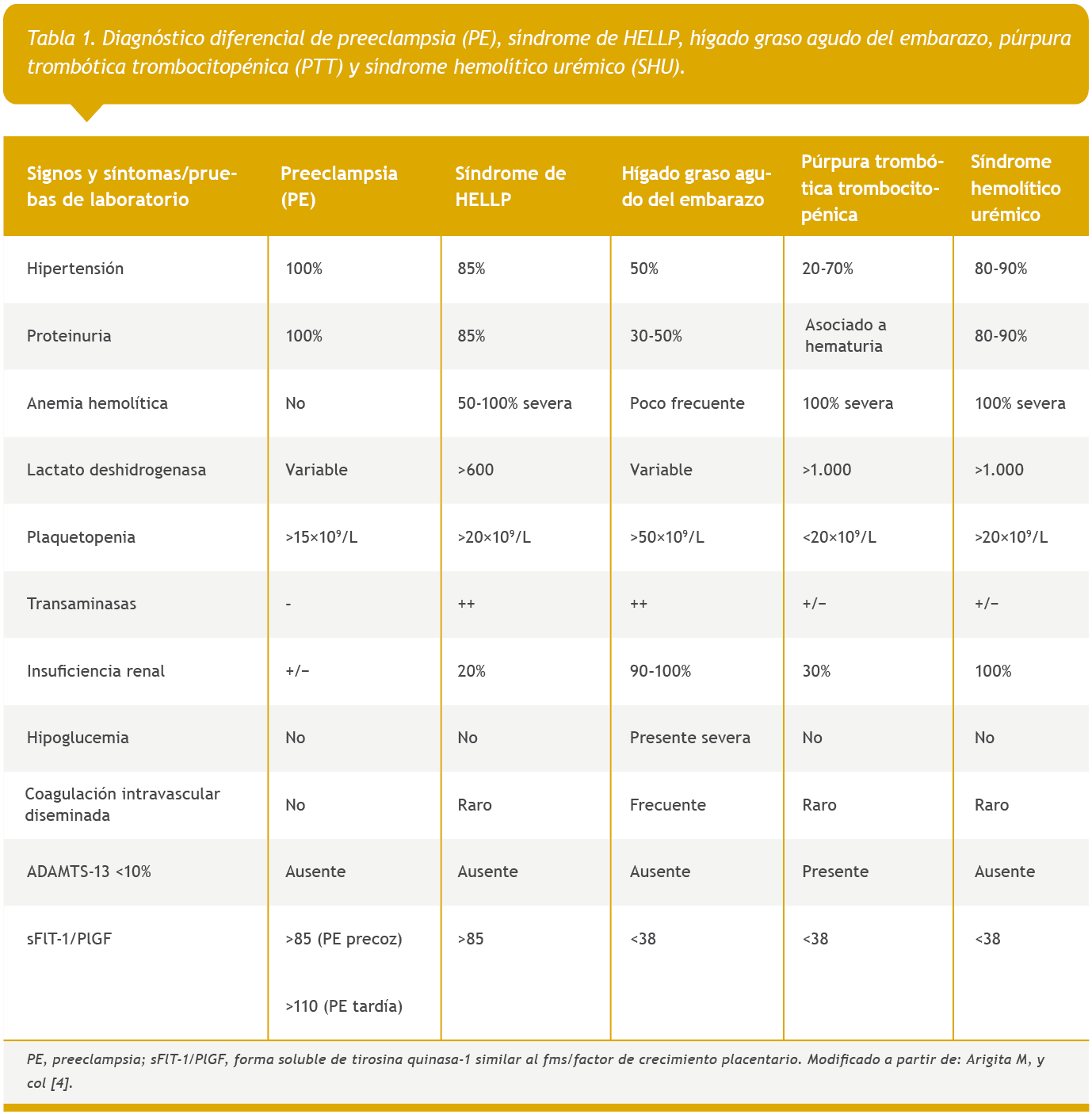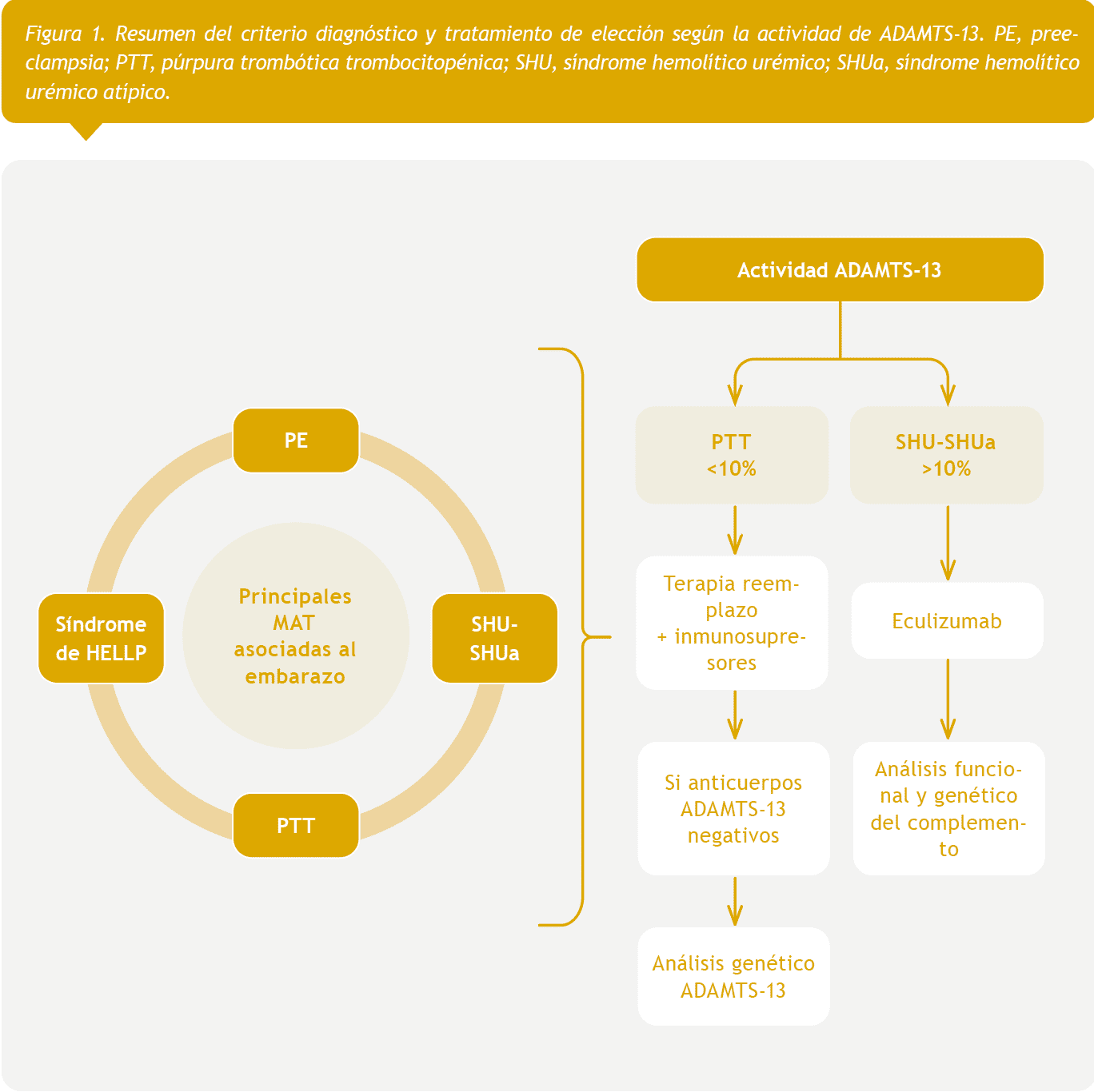 Las microangiopatías trombóticas (MAT) que se presentan en el embarazo o puerperio pueden ser difíciles de diagnosticar y tener impacto en la madre y en el feto. Existen diferentes formas de MAT asociadas al embarazo, como preeclampsia (PE), síndrome de HELLP, púrpura trombótica trombocitopénica (PTT), síndrome hemolítico urémico (SHU), hígado graso agudo del embarazo, síndrome antifosfolípido e incluso hemorragias post-parto graves. Estas patologías comparten síntomas y signos por lo que es importante realizar un correcto diagnóstico diferencial [1, 2].