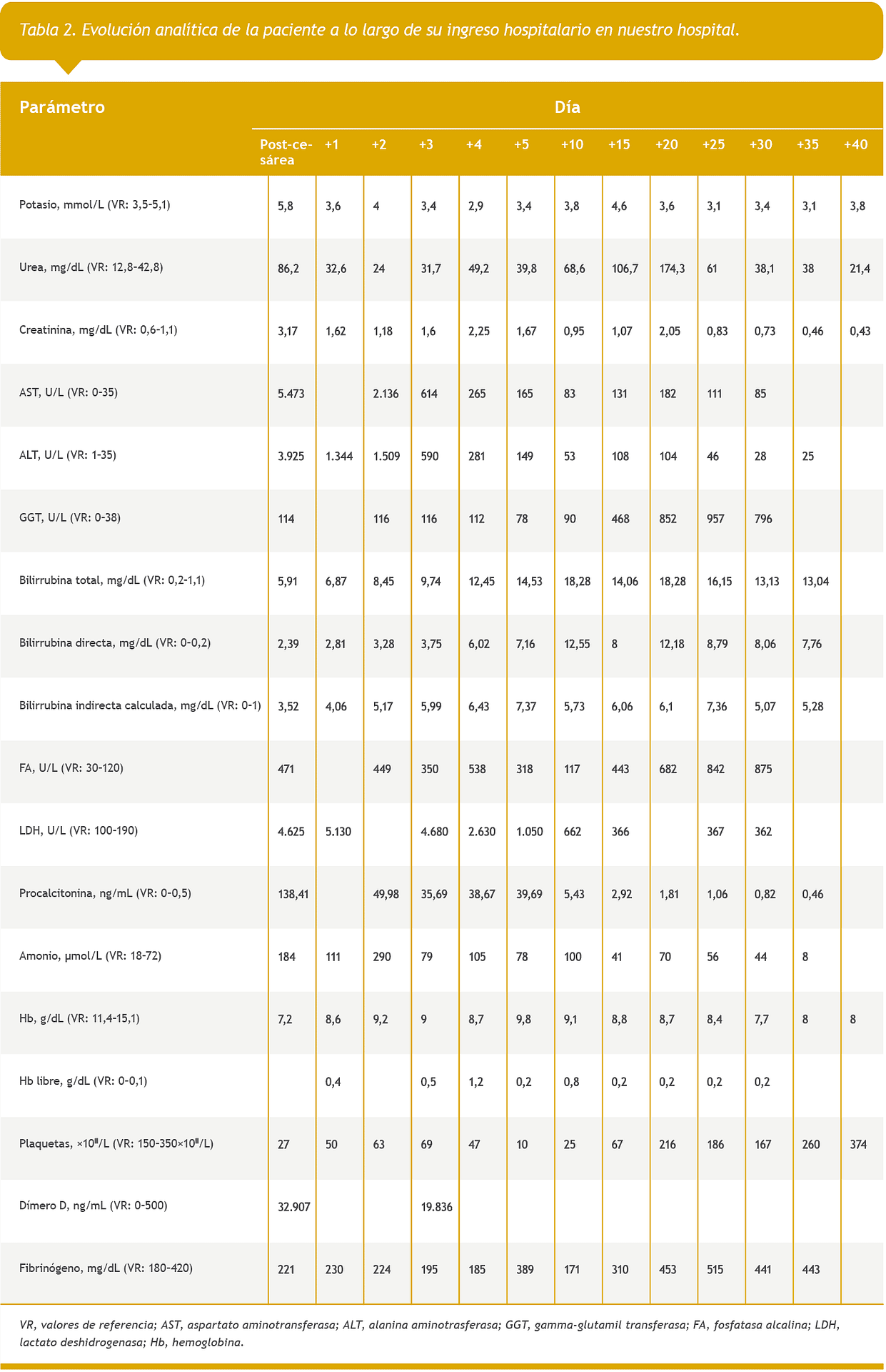 Tras la cirugía presenta tensiones arteriales elevadas y se evidencia deterioro de función renal, fallo hepático grave y alteración de parámetros hematológicos. Aumenta el deterioro clínico y analítico con creatinina: 1,79 mg/dL (0,51–0,95 mg/dL), ALT: 266 U/L (10–49 U/L), AST: 621 U/L (≤34 U/L), lactato deshidrogenasa (LDH): 1.201 U/L (120–246 U/L), procalcitonina: 64,5 ng/mL (≤0,5 ng/mL), lactato: 4,4 mmol/L (0,5–1,6 mmol/L), hemoglobina: 10,1 g/dL (12–15 g/dL), plaquetas: 39×109/L (140–450×109/L) y dímero D: 35.200 ng/mL (0–500 ng/mL). Ante cuadro de insuficiencia hepática aguda grave en contexto de síndrome de HELLP, se contacta con nuestro hospital (Unidad de Referencia en trasplante hepático) y se traslada a la paciente a la Unidad de Cuidados Intensivos (UCI).