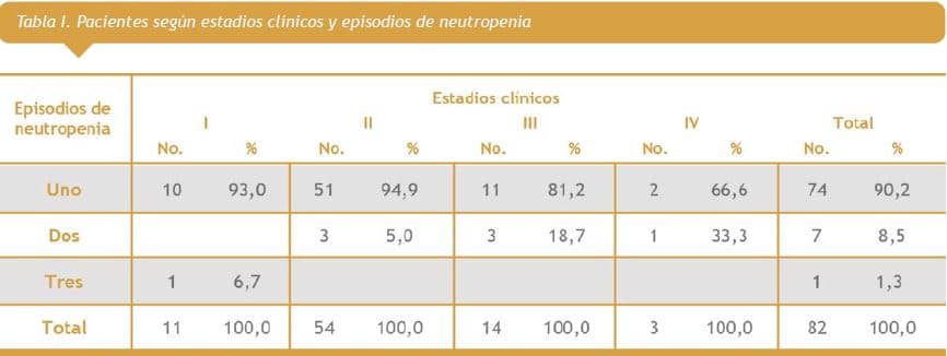 De las 201 pacientes tratadas con citotóxicos, 82 presentaron neutropenia, que representó 40,7% del total. En la Tabla 1 se muestra que la mayoría de las pacientes padecieron solo un episodio de esta reacción adversa (90,2%), y que el estadio clínico II fue el predominante, con 54 pacientes.