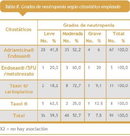 Se observó que de los 3 grados de neutropenia padecidos por las pacientes (Tabla 2), el moderado fue el más frecuente, seguido del leve. Aunque el Taxol® fue el citostático que mayormente produjo neutropenia moderada, no se encontraron diferencias significativas al aplicar X2, por lo que no hubo asociación entre los grados de leucopenia y los esquemas de quimioterapia aplicados.