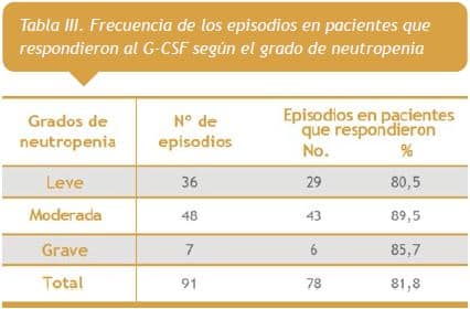 Se demostró, además, que la neutropenia inducida por citotóxicos puede aparecer en diferentes grados en los pacientes, pero sin asociarse estadísticamente a ningún citostático en particular ni a la respuesta al tratamiento con G-CSF, pues más de 80% de los episodios en los 3 grados clasificados respondieron positivamente, para así coincidir con todos los resultados notificados por otros investigadores.3,5,13,16