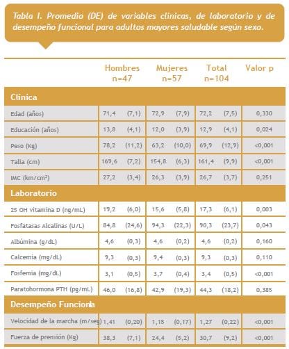 Un total de 384 personas respondieron al llamado a participar en el estudio, de ellas se seleccionaron 104 (27,1%) personas que cumplían con el criterio de tener un estado general saludable, 54,8% género femenino, edad promedio de 72,2 años (60-98) y educación promedio 12,8 ± 4,1 años. Las características generales y de laboratorio, según género, se muestran en la Tabla 1 (ver primer imagen a la derecha). Todos los valores de calcemia, albúmina y fósforo se encontraron en rangos normales.