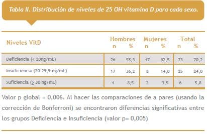 La VitD plasmática promedio fue de 17,3 ± 4,2 ng/mL, siendo significativamente menor en mujeres (15,6 ± 5,8 ng/mL) comparada con el valor en hombres (19,2 ± 6,0 ng/mL) (p = 0,003). Al analizar los valores de VitD según las categorías destaca la alta prevalencia de deficiencia global (70,2%) que en mujeres llega a 82,5%, siendo considerados en rango suficiente sólo 8,5% de los hombres y 3,5% de las mujeres (p = 0,006) (Tabla 2).