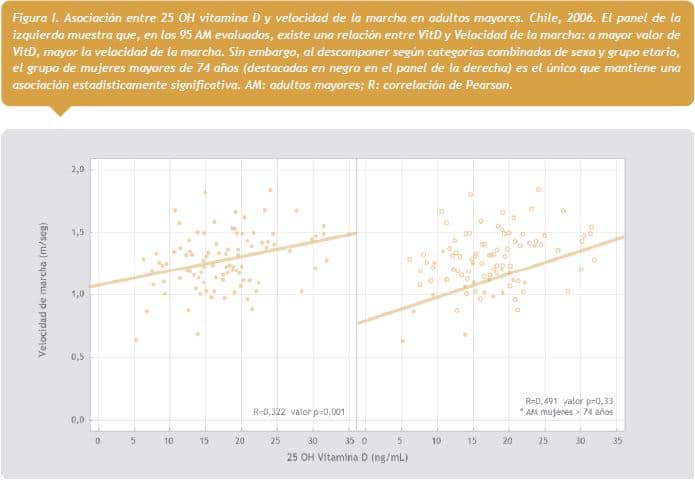 Este estudio corrobora que la de deficiencia de VitD es masiva en personas mayores chilenas saludables, encontrándose que menos de 10% de ellos presenta niveles suficientes. Además se observó una correlación directa entre los niveles de VitD y el desempeño funcional, evidenciándose una menor velocidad de la marcha y menor fuerza de prensión a medida que los niveles de VitD disminuían, asociación especialmente marcada en mujeres mayores de 74 años.