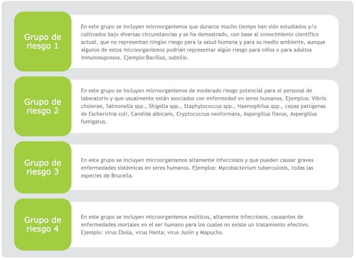 El concepto de grupo de riesgo fue desarrollado como una manera de clasificar los diferentes tipos de microorganismos (bacterias, virus, hongos, parásitos) dependiendo del grado de virulencia para el ser humano, animales y plantas. Se han definido cuatro grupos de riesgo de microorganismos, cuyas características se indican a continuación: