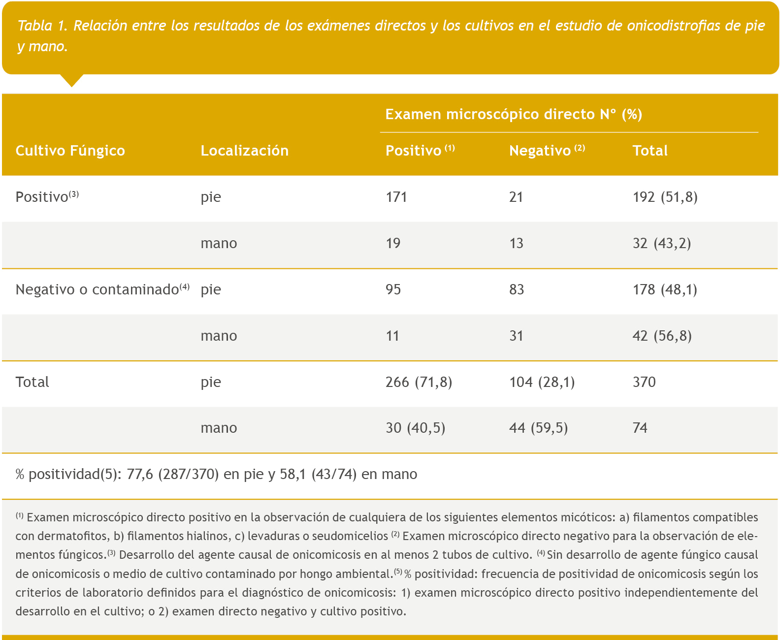 Las onicomicosis representan la principal causa de onicodistrofias, ya que producen hasta el 50 % de las afecciones ungueales (2, 4, 6). Se las considera una de las micosis superficiales con mayor dificultad de diagnóstico y tratamiento (3, 6, 8, 9, 13, 15).