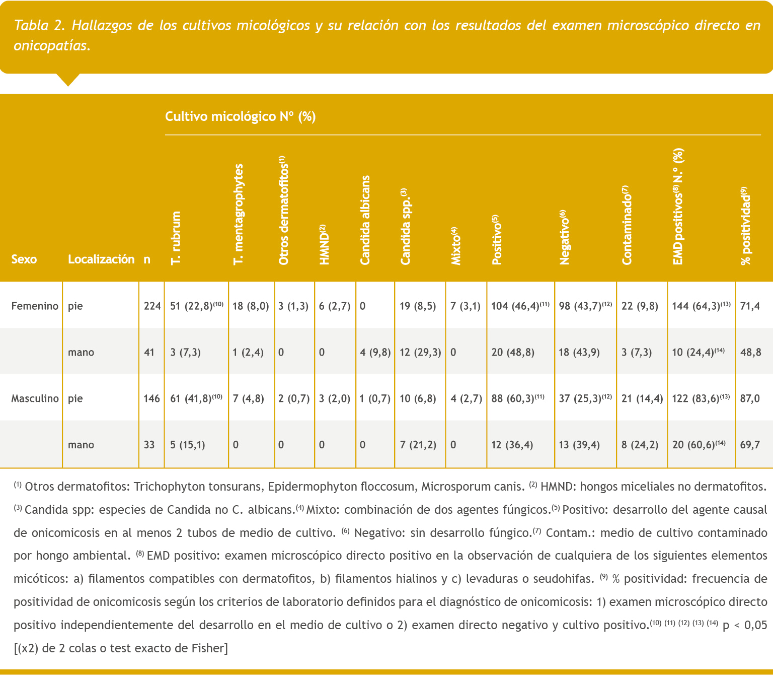 En 262/279 onicomicosis de pie (93 %), la lesión ungueal estuvo en el hallux; la ubicación que le siguió en frecuencia fue la del 5° dedo (65 %). Asimismo, la afección de la uña del pulgar fue la más frecuente entre las onicomicosis de mano (30/45; 67 %), seguida por la del índice (58 %). T. rubrum fue el aislamiento más frecuente en pies (p < 0,05) y los porcentajes de positividad del ED y de los cultivos fueron mayores para los varones (ambas, p < 0,05) (Tabla 2).