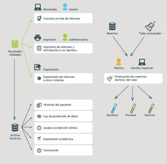 El sistema informático de laboratorio contiene toda la información relativa a las determinaciones analíticas de los pacientes como de sus controles internos, externos y puede ser visto como un archivo de datos que suministra información a otras aplicaciones, bien con fines clínicos o estadísticos.
