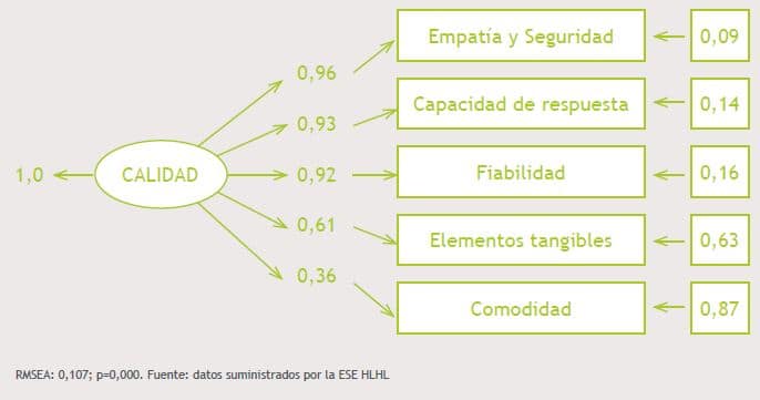 Las dimensiones Empatía y Seguridad, Capacidad de respuesta y Fiabilidad son las que más contribuyeron en la conformación de la percepción de la calidad, seguidas por la dimensión Elementos tangibles y la dimensión Comodidad, con más del 90 % de la variabilidad explicada de la calidad. La dimensión Elementos tangible aportó el 61 % y la Comodidad, el 36 % (Fig. 1). Respecto a la precisión de las dimensiones, el error de medición mayor fue para la dimensión Comodidad con el 0,87, seguido de la dimensión Elementos tangibles con 0,63 y las demás por debajo o cercano a 0,10.