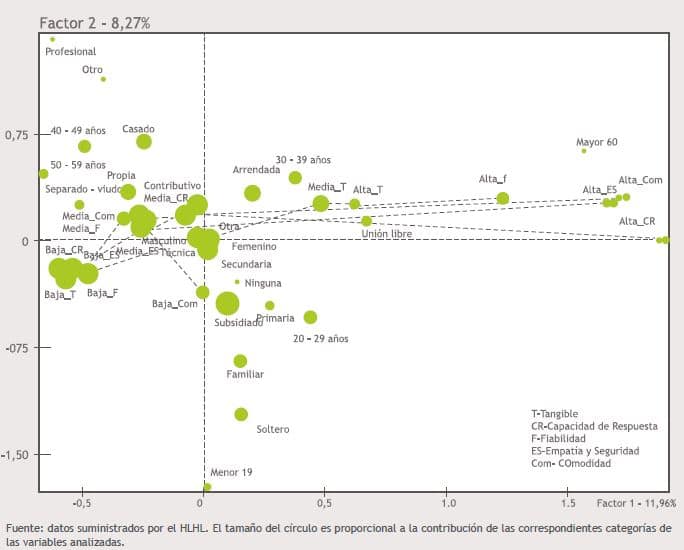 En el análisis de correspondencias múltiples, el plano factorial indica que con un aporte de 11,88 % en la explicación de la variabilidad de los datos el factor 1 está asociado a la “edad” y la “percepción de la calidad”, y el factor 2 que aporta el 8,27 % de variabilidad explicada al “género”, “la profesión” y el “estado civil” del paciente (Fig. 2). En el cuadrante I, se ubican los pacientes casados, con vivienda propia, con escolaridad profesional y técnica, con edades entre 40-59 años y régimen de afiliación especial con percepciones medias de la calidad de atención. En el cuadrante II se encuentran los pacientes entre 30-49 años, separados o viudos, régimen de afiliación vinculados, y ningún nivel de escolaridad, con percepciones altas en la atención en urgencias y consulta externa. En el cuadrante III, se ubican los pacientes menores a 29 años, con vivienda familiar, solteros, y régimen contributivo. En el cuadrante III y IV, están los pacientes que tienen educación primaria y secundaria, régimen subsidiado, viven en unión libre y en vivienda arrendada y tienen una baja percepción en calidad de atención del hospital.