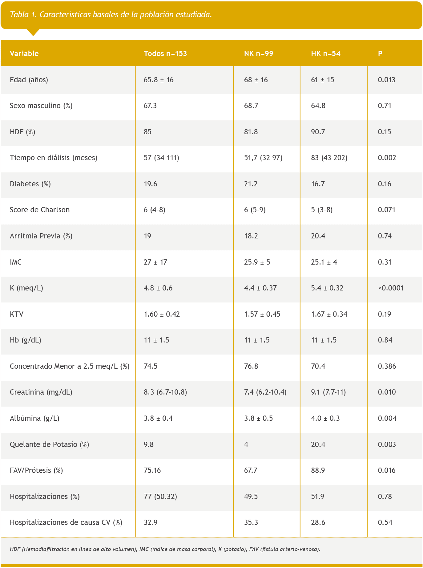 Al comparar a los pacientes HK (n=54) vs NK(n=99) encontramos diferencias significativas en edad (61 vs 68 años p=0.013), tiempo en diálisis (83 vs 51 meses p=0.002), acceso vascular (FAV/prótesis) (88.9 vs 67.7% p=0.016) y uso de quelantes del K (20.4 vs 4% p=0.003), con una tendencia a la significancia a favor de los NK en el score de Charlson (5 vs 6 p=0.07) (Tabla 1).