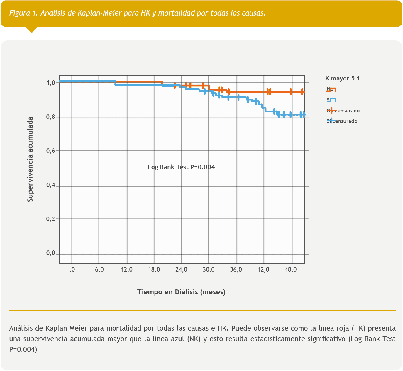 En el análisis de Kaplan-Meier, los pacientes HK tuvieron menor mortalidad total (Log Rank Test: P= 0.004) (Figura 1).