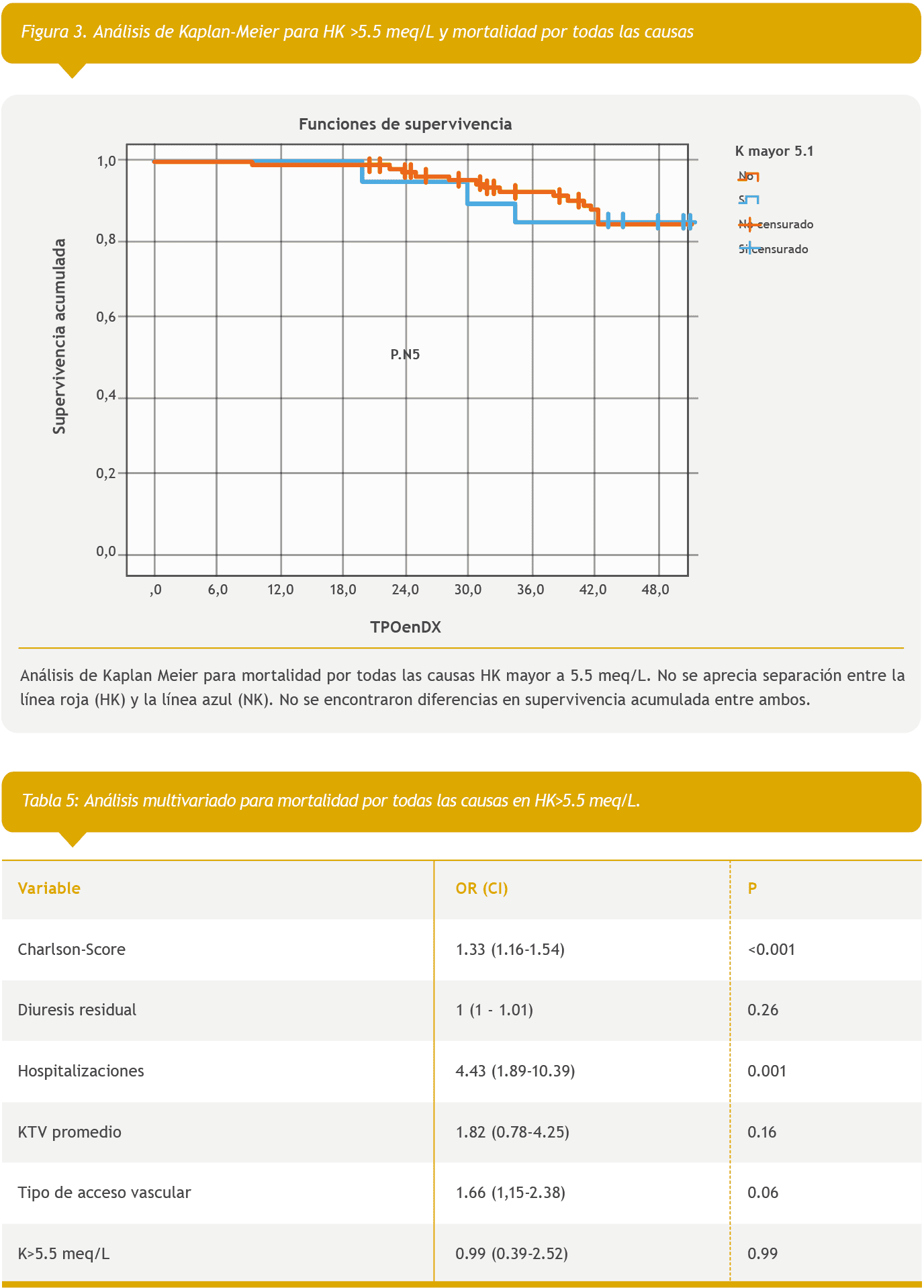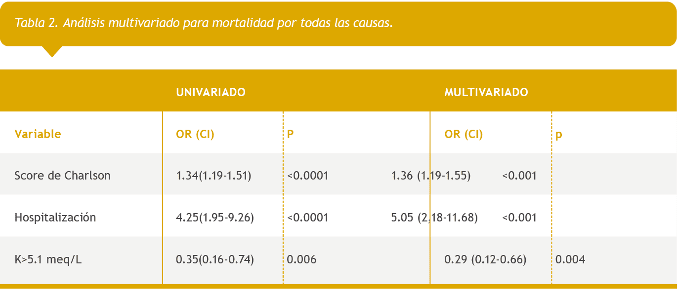 Análisis univariado y multivariado para mortalidad por todas las causas en HK mayor a 5.5 meq/L. Se asociaron significativamente a mayor mortalidad: Score de Charlson, hospitalizaciones y tipo de acceso vascular (catéter).