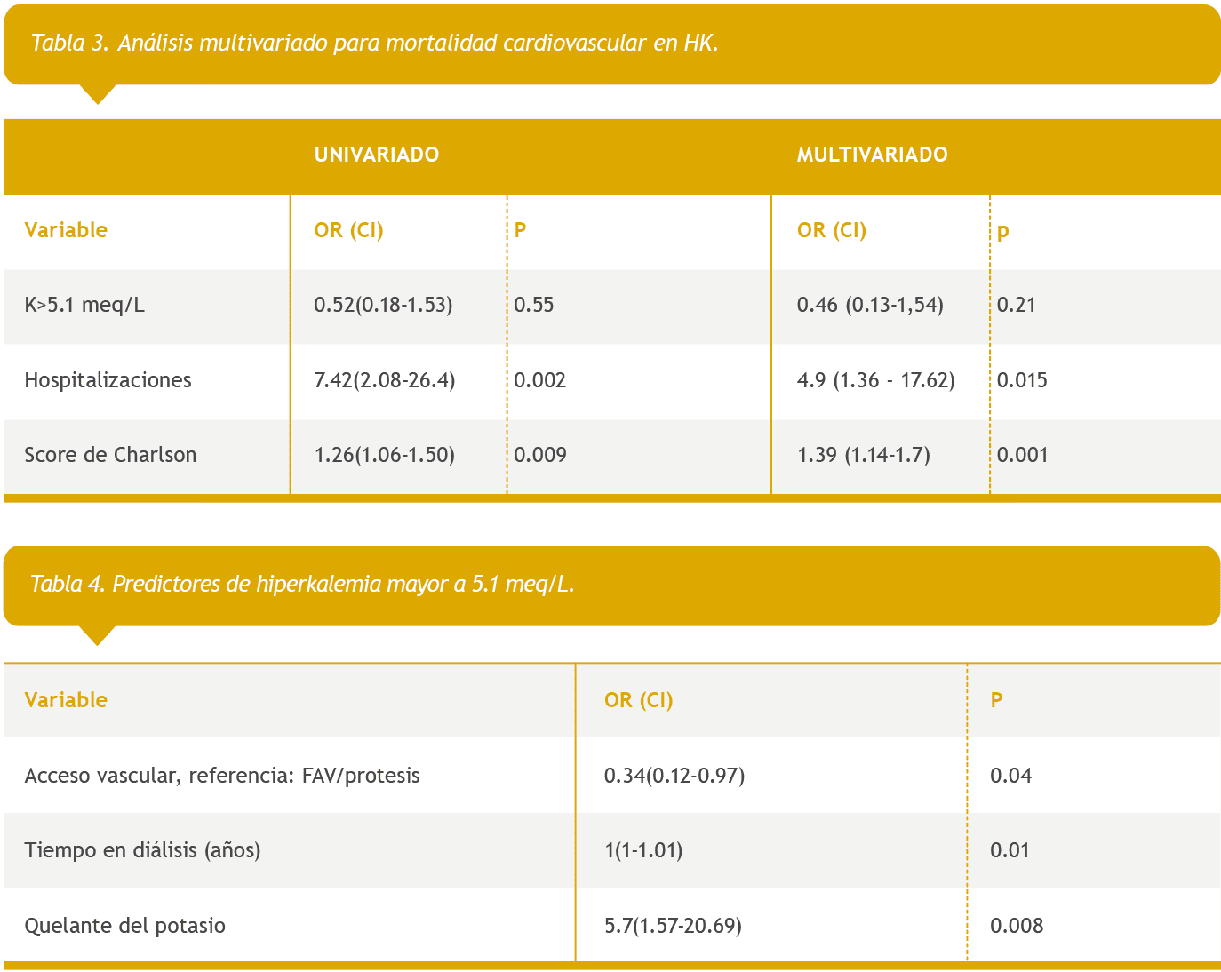 Cuando se analizaron las variables predictoras de HK (K>5.1 meq/L) por medio de regresión logística, el acceso vascular (prótesis/FAV), tiempo en diálisis y uso de quelantes del potasio, resultaron estadísticamente significativos (Tabla 4).