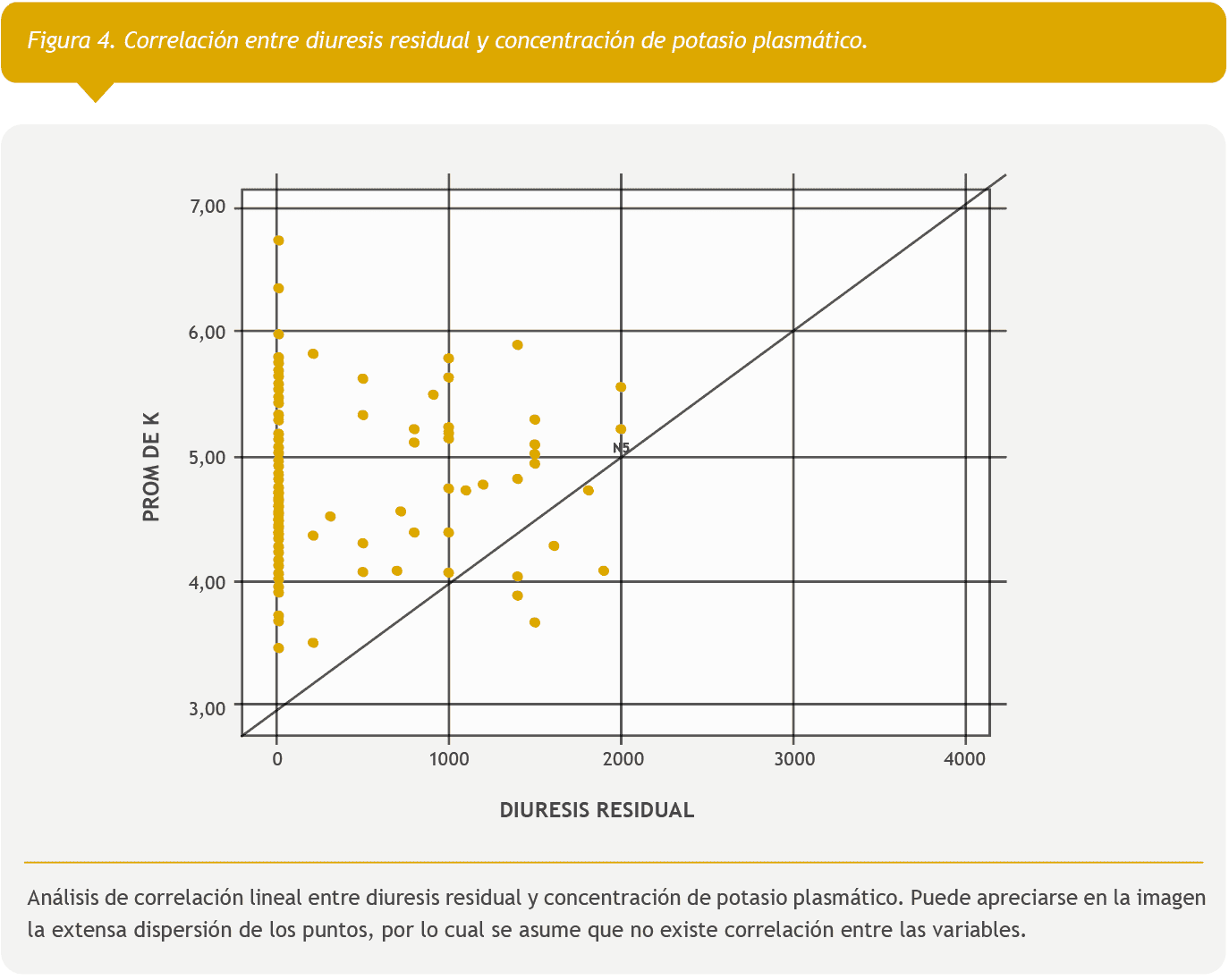 Finalmente se analizó si existía correlación entre el promedio de las concentraciones plasmáticas de K halladas y la diuresis residual, la cual resultó no significativa (Figura 4).