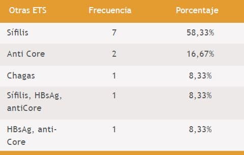 Otras infecciones concomitantes se detectaron en 12 donantes y fueron con mayor frecuencia la Hepatitis B y sífilis (cuadro N°1).