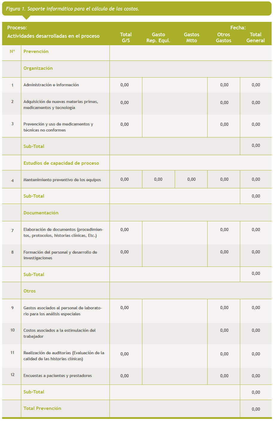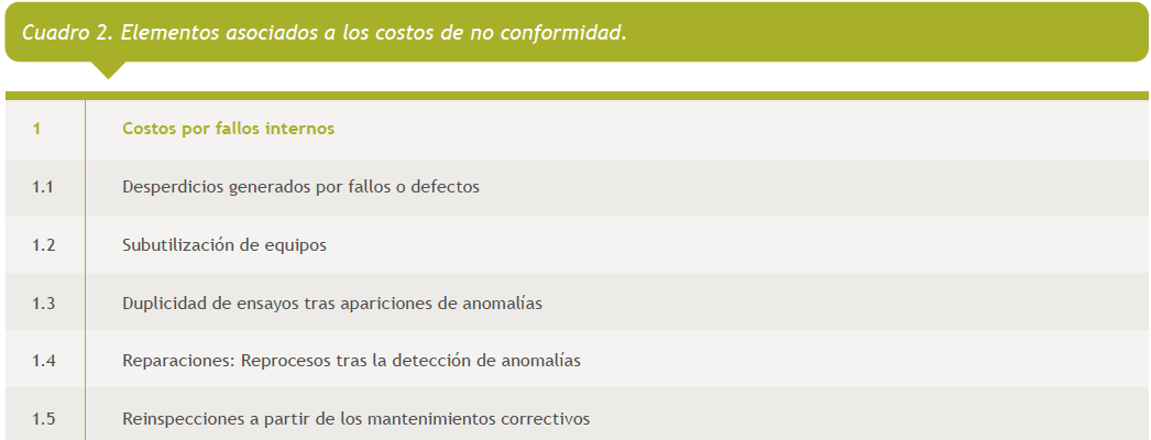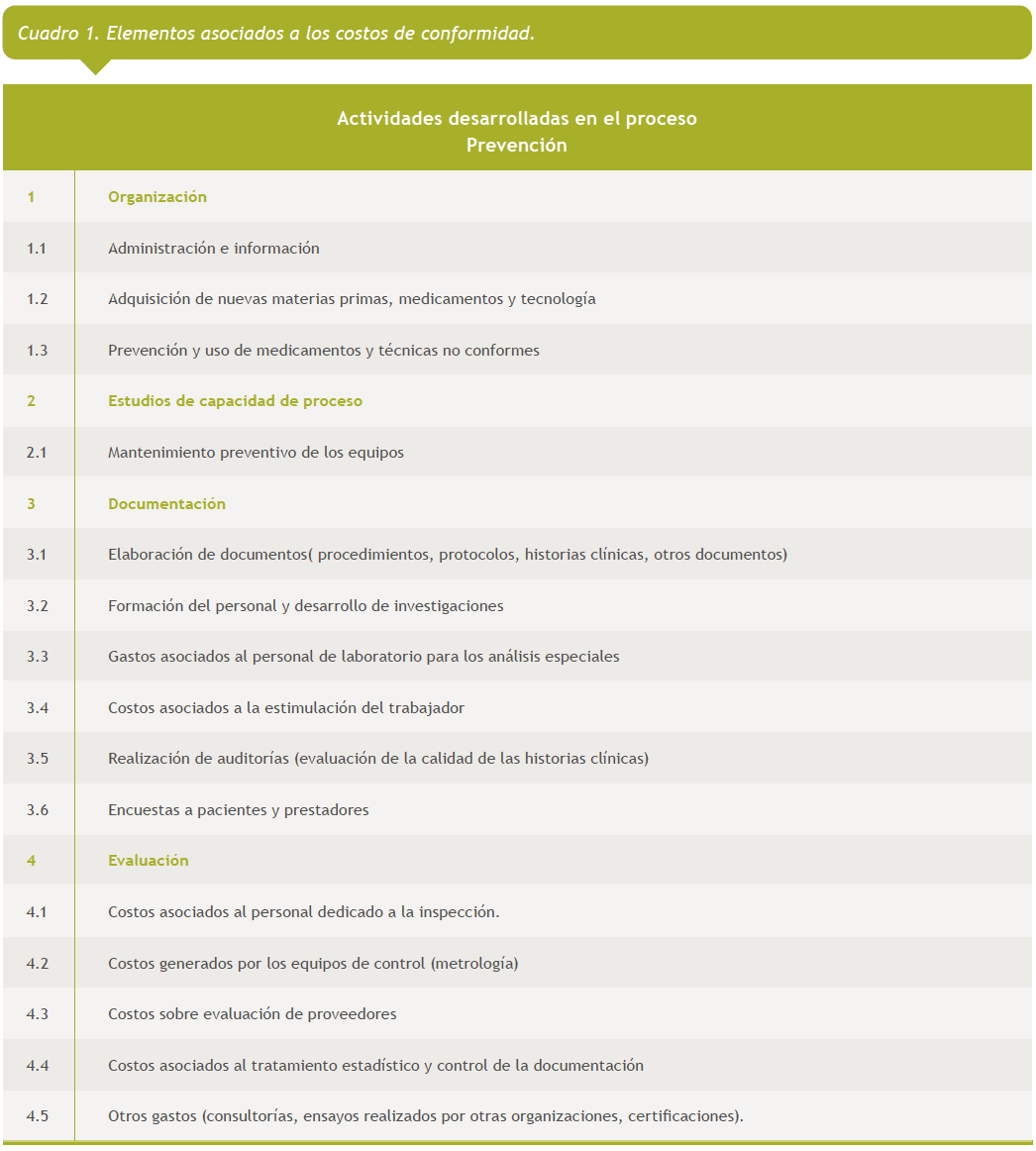 El cuadro 1 muestra los costos relacionados con la prevención y evaluación dividida en: organización, estudios de capacidad de proceso, documentación y evaluación.