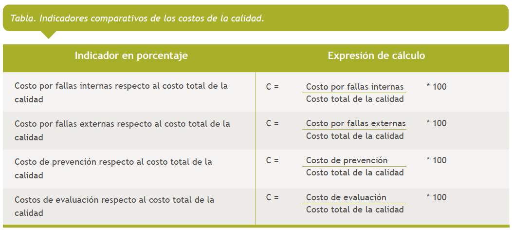 Finalmente esta información permitió calcular indicadores de evaluación, que facilitan la detección de problemas de calidad, sobre la base de ponderar el peso de cada categoría (prevención, evaluación, fallos) sobre el costo total de calidad, a la vez que permite priorizar acciones de mejoramiento según los resultados previos (Tabla).
