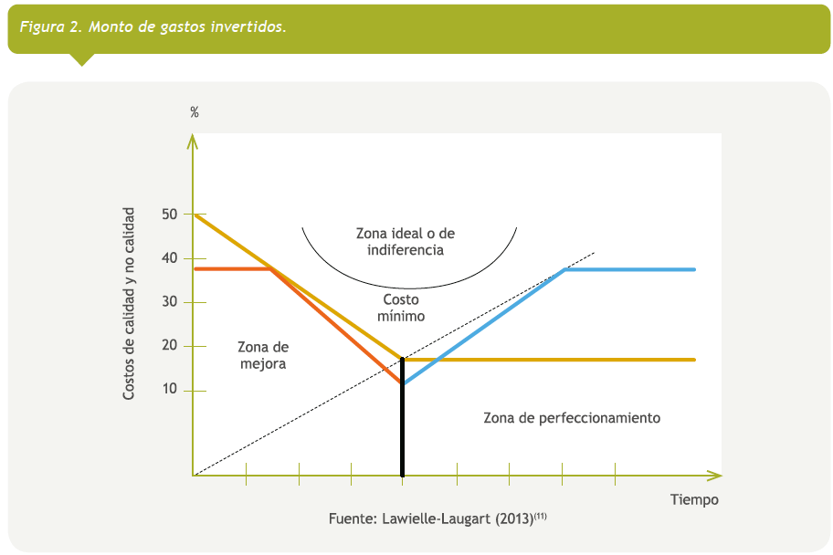 Lavielle-Laugart (2013)(11) plantea que es estratégico ser eficientes en el Sistema de Gestión de Calidad (SGC) pues la medición será un medio de control, que permitirá identificar actividades o procesos ineficientes que requerirán del mejoramiento continuo. Refiere que una empresa ha de ubicarse según el monto de lo gastos invertidos en una de las tres zonas posibles: zona de mejora, de indiferencia o de perfeccionamiento (Fig. 2).
